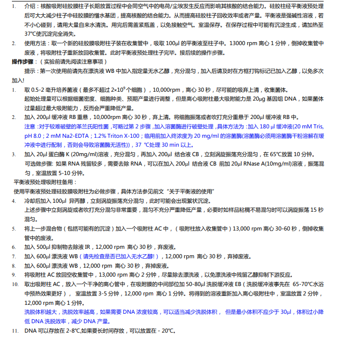 独特的结合液/蛋白酶K迅速裂解细胞和灭活细胞内核酸酶,然后基因组DNA在高离序盐状态下选择性吸附于离心柱内硅基质膜, 再通过一系列快速的漂洗-离心的步骤,抑制物去除液和漂洗液将细胞代谢物,蛋白等杂质去除, 最后低盐的洗脱缓冲液将纯净基因组DNA从硅基质膜上洗脱。